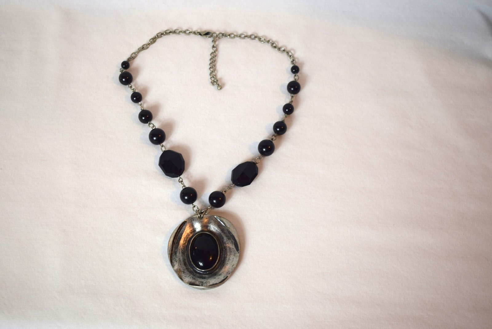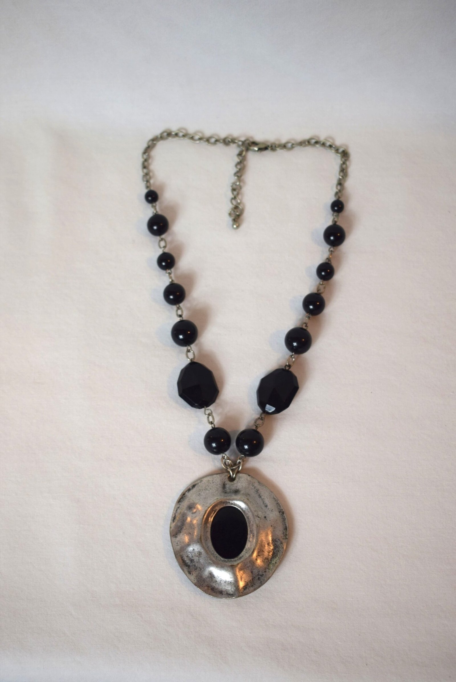 Vintage Silver Tone Black Bead Necklace with Large Oval Pendant with Black Stone